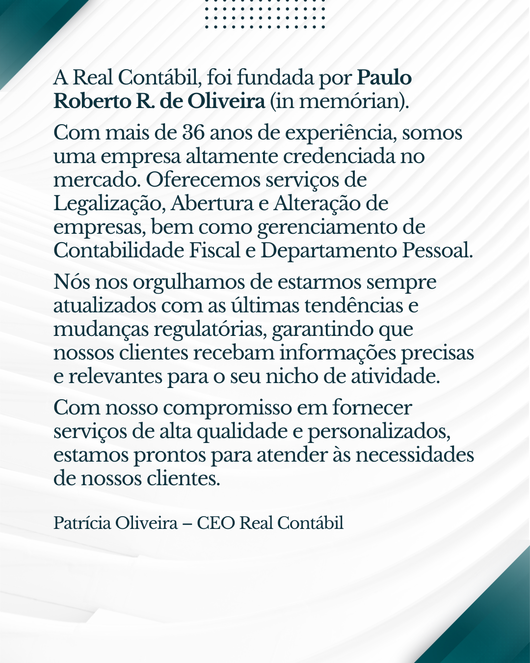 Hoje, sob a liderança de Patrícia Oliveira — CEO da Real Contábil — seguimos fortalecendo relações de confiança e entregando soluções que refletem seriedade, responsabilidade e profissionalismo.